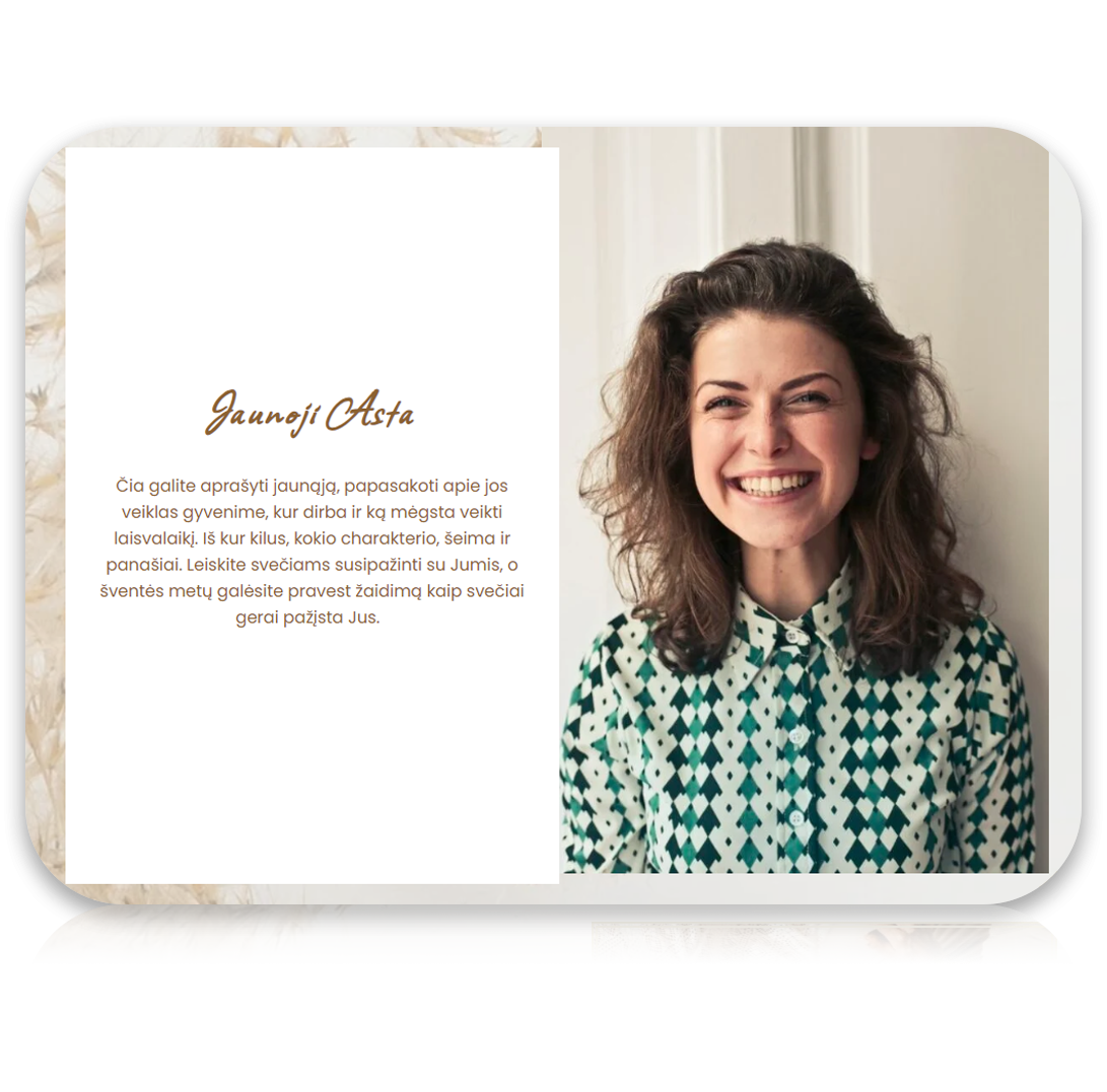 Tai modulis, kuri galime pridėti prie Jūsų pasirinkto šablono papildomai. Šiame modulyje jaunieji gali prisistatyti ir papasakoti daugiau apie save. Galite aprašyti savo veiklas gyvenime, kur dirbate ir ką mėgstate veikti laisvalaikį, bei daug kitos įdomios informacijos apie Jus.  Leiskite svečiams susipažinti su Jumis, o šventės metų galėsite pravest žaidimą kaip svečiai gerai pažįsta Jus.